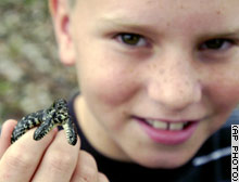 October 17, 2003 - CNN :: Kentucky: Hunter York was afraid of snakes, but he couldn't resist the two-headed reptile he found. The 10-year-old said he picked up the black king snake with a stick, then noticed it grabbed the stick with two heads. The 81/2-inch female reptile hasn't eaten since Hunter found it October 4. Ed Zimmer, a Murray State University biology professor and herpetologist, estimated the occurrence of a two-headed snake at 1 in 10,000.