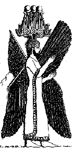 The winged figure has been interpreted as either a winged geni, or as some form of idealized portrait of Cyrus the Great, possibly representing the King's 'Fortune'. Some interpretation such as this seems inevitable, given that the figure wears a crown and Elamite royal robe. 'Resting on the long twisted horns of the Abyssinian ram (Ovis longipes palaeo-egyptiacus), between two opposed uraei of the headress consists of three bunches of reeds, each surmounted by a solar disc and each set against a background of osterich feathers. Three solar discs with concentric circles mark the bottom of the reed bundles.
