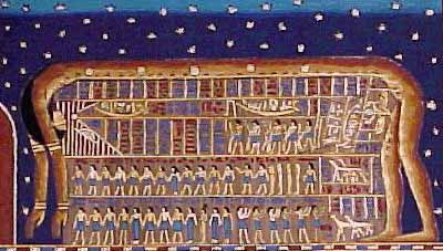 On the Southern section of this image - Nut has ten solar disks running along her body, as well as one at her mouth and another one at the birth canal between her legs painted with the image of Khepri (the god of coming into being). No disks are depicted on the northern facing Nut because the sun is always seen to traverse the southern part of the sky in Egypt.
