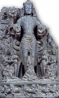 The worship of the sun is universal. To the Indians, the sun was the ancient ancestor of the human race and the distributor of wealth. The sun god's iconographic aspects were established by the Vedic period (ca. 1500 -1000 B.C.), and several are depicted in this stela of the god in human form. Among them are solar discs represented by two blooming lotuses flanking the god's head.