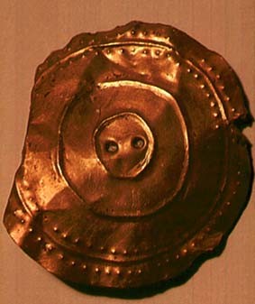 The Banc Ty'nddol sun-disc is a small, decorated, gold ornament discovered at Cwmystwyth, Ceredigion, Wales. It most likely was part of a funerary garment and is more than 4,000 years old, which makes it the earliest gold artifact found in Wales. It was discovered on October 16, 2002 by a team of archaeologists who were investigating the site of Roman and Medieval lead smelting hearths below the Bronze Age copper mine on Copa Hill. The area around Cwmystwyth, has been mined for lead and copper for more than 4,000 years, almost since the beginning of metalworking in the British Isles.