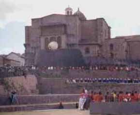 At dawn on the 'Day of Cusco' and the Inti Raymi honors the Inca and his people the god of the Sun in the Qorikancha or the Temple of the Sun where the Santa Domingo was built. Seen from the Avenida del Sol is the festival starting and the four provinces of the Incas, the four Suyus as part of Tawantinsuyu come together to give thanks to the Sun. On top of the beautiful perfectly shaped granite wall before the Santa Domingo makes the Inca his speech.