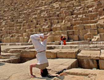 Giza Plateau .. Balancing on his head in the shadow of the ancient pyramids of Giza, a Dutch visitor tried to connect to the spiritual forces he said were swirling around the monuments during the solar eclipse. "The eclipse is a special moment in time and the shape of the pyramids attracts a universal energy spiral," Robin, who did not give his full name, said after meditating at the foot of the largest of the pharaonic mausoleums in the desert outside Cairo. "We are all made of light. Light is what binds us all and makes all us humans one, so this is a very important time to be here," said the Dutchman while standing barefoot in a circle of people meant to symbolize the sun.