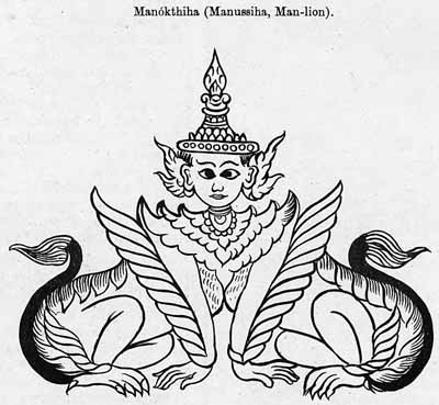 In Burma, the sphinx is known as manussiha (manuthiha). It is depicted on the corners of Buddhist stupas, and its legends tell how it was created by Buddhist monks to protect a new-born royal baby from being devoured by ogresses.