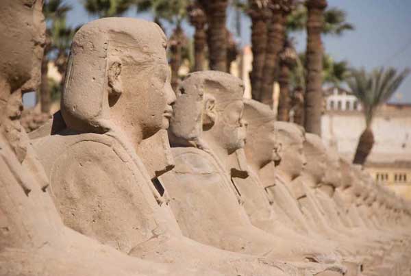 Large-scale examples carved in stone often served to guard sanctuaries in ancient Egypt. Although usually depicted in a recumbent position, some sphinxes were shown trampling Egypt's foes.