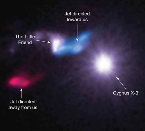 The life cycle of stars comes full circle in a new photo taken by NASA's Chandra X-ray Observatory and the Smithsonian's Submillimeter Array (SMA), which may reveal new clues for studying star evolution. The photo captures a large cloud called Cygnus X-3 and another smaller cloud, nicknamed the "Little Friend." Cygnus X-3 contains a massive, short-lived star that is slowly being eaten by a companion black hole or neutron star and, as a result, produces bright, powerful X-rays. The Little Friend, on the other hand, is a dense cloud of gas and dust that gives birth to new stars called a Bok globule. Take a video tour of the "Little Friend".