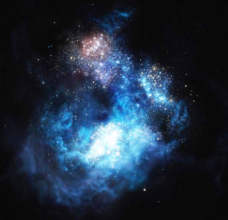 Astronomers using several of the largest telescopes on Earth and space have discovered the brightest galaxy yet found in the early Universe and have strong evidence that examples of the first generation of stars lurk within it. Astronomers have long theorized the existence of a first generation of stars known as Population III stars that were born out of the primordial material from the Big Bang. All the heavier chemical elements essential to life - including oxygen, nitrogen, carbon and iron - were forged in the bellies of stars. This means the first stars must have formed out of the only elements to exist prior to stars: hydrogen, helium and trace amounts of lithium.
