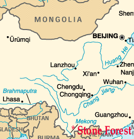 \The Stone Forest is situated in the Lunan Yu Autonomous County 126 kilometers southeast of Kunming. A typical karst formation, the Stone Forest covers an area of more than three hundred square kilometres. Kunming is nicknamed City of Spring due to the fact that it is covered all year round with the rich verdure of trees and plants. Endowed with a pleasant climate, the city's 15,000 square kilometres of land is adorned with more than 400 kinds of flowers.