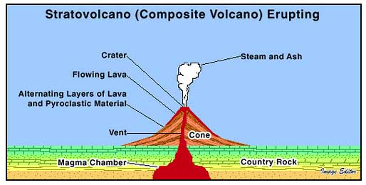 A stratovolcano, also known as a composite volcano, is a tall, conical volcano built up by many layers (strata) of hardened lava, tephra, pumice, and volcanic ash. Unlike shield volcanoes, stratovolcanoes are characterized by a steep profile and periodic, explosive eruptions and quiet eruptions. The lava that flows from stratovolcanoes typically cools and hardens before spreading far due to high viscosity. The magma forming this lava is often felsic, having high-to-intermediate levels of silica (as in rhyolite, dacite, or andesite), with lesser amounts of less-viscous mafic magma. Extensive felsic lava flows are uncommon, but have travelled as far as 15 km (9.3 mi).