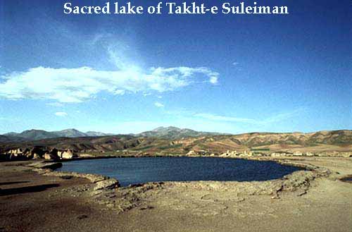 Takht-e Suleiman means the Throne of Solomon. It is one of the most interesting and enigmatic sacred sites in Iran. Its setting and landforms must certainly have inspired the mythic imagination of the archaic mind. Situated in a small valley, at the center of a flat stone hill rising twenty meters above the surrounding lands, is a small lake of mysterious beauty. Brilliantly clear but dark as night due to its depth, the lake's waters are fed by a hidden spring far below the surface. Places like this were known in legendary times as portals to the underworld, as abodes of the Earth spirits.