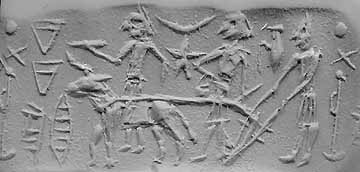 Cylinder Seal Showing God of Agriculture and Two Others Plowing