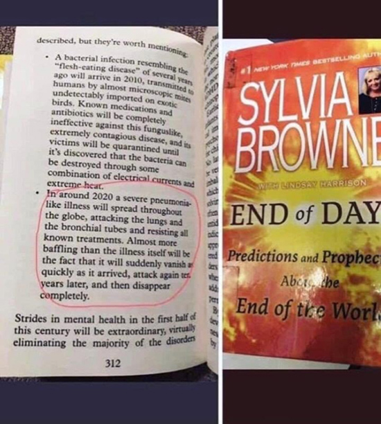 This passage from one of Sylvia Browne's books made the news. Some of the facts are correct but only a small percentage of the population are dying - mostly seniors and/or those with pre-existing bronchial conditions. There are people who are treating this like a bad cold or the flu and staying home taking care of themselves.