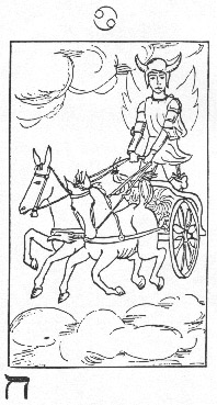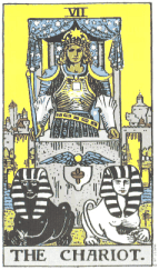 The Chariot card is 7th in the series of the Major Arcana. The chariot driver controls the chariot with no reins or other harnesses, he expresses his will to control the functions and direction of the positive and negative forces representing the white and black sphinxes. This card is symbolic of the soul and the physical shell. The cart is enclosed and represents speech, for in speech we enclose ideas an set them into motion. Vocabulary can also serve as a protective unit by the power of words that strike home to the souls of others. The square on his breast plate is symbolic of order and control over the material world. This card falls under the vibration of the number 7.