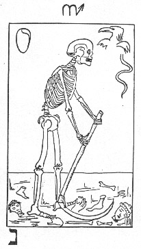 This card represents transformation and rebirth of consciousness. The death skeleton comes to all as shown in the picture, child father, mother, king and priest. Death has no care for station in this material plane and all suffer the same fate in the end. The white horse that is well tamed, symbolic of pure desires and the submissiveness to the cycles of life.