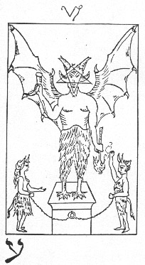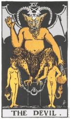The devil card represents blindness and misconception. The black background is the lack of light or understanding. The 2 humans, male and female are loosely bound to the stone pillar. They could easily remove their bindings, but stay there by will. The pillar that they are chained to is half of a square, representing the half truths that they bind themselves to. The torch that the devil is holding is pointing down, and the flame is eating at the torch in a wasteful way, not giving off any light.