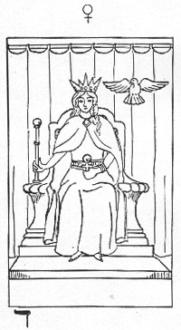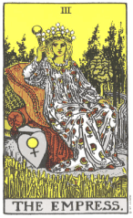 The Empress card is another aspect of the subconscious, but unlike The High Priestess being memory. The Empress or number 3 responds to this memory which evolves in creativity and imagination. It is within this energy that conscious and the subconscious bring forth manifestation. The plant life in the card represents the cultivation within the subconscious. The stream in the background falling into the pool is symbolic of the joining of the conscious and the subconscious. The stars on her crown represent the 12 signs of the zodiac, indicating that time...brings desires into manifestation. This card falls under the vibration of the number 3.