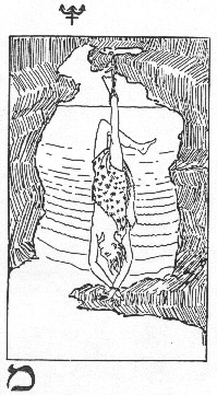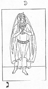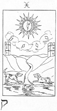 The moon card represents the evolution of spirit. The shell fish is symbolic of life emerging from the water of creation and starting on the path of return to the creator. The path is narrow and long representing the trials and the length of time that evolution takes. The path has its ups and downs and is not completed right away, but a slow process of learning and focus. The 32 tongues of fire falling from the moon are symbolic of the 32 paths to the tree of life. The dogs are symbolic of mans nature, one is trained, and the other is wild, the positive and negative forces that we must control to complete our time here.