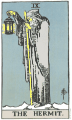 One who has mastered all elements of the past key numbers and stands on top of the mountain of attainment. The snowy peaks is symbolic of his isolation because his wisdom sets him apart from the rest. In this position, he holds his lantern to light the way for the rest to follow his path to enlightenment, for knowledge is meaningless unless we turn and show others what we have learned. The lantern light is 2 triangles, one face up and the other face down. As is above, so below. A triangle only holds 180 degrees, but the combination of 2 triangles equals 360 degrees. A circle has 360 degrees and is the symbol of the creator, endless. 360 degrees and 180 degrees both vibrate at a number 9, the vibration of this cards.