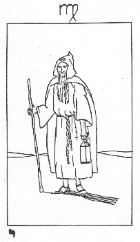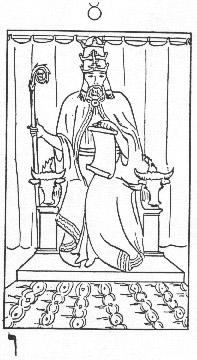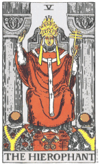 The Hierophant represents our inner being, the teacher, and intuition. Intuition is a collection of all of the facts from the conscious mind, sent to the subconscious which in turn looks at the information and acts upon it sending it back to the conscious. True intuition is based upon reason and a collection of the facts. The crown at the top of the head has 5 points representing the 5 senses. Likewise it has 3 levels representing the 3 levels of mind, conscious, subconscious and super conscious. The grey background is symbolic of wisdom, for grey is a mixture of black and white and is the balance of the 2 forces. The keys at the feet are representing the key to super conscious, for in the union of the conscious and subconscious, enlightenment is achieved. This card fall under the vibration of the number 5.