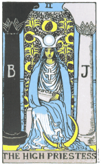 This card represents the subconscious mind. It is the balancing force between pairs. The pillars to her sides represent the opposites, light and dark, and she sits in the middle of them, impartial to one or the other. The curtain behind her connects the pairs. The letters on the pillars are B and J. The B is symbolic of the number 2 falling as the second letter in the alphabet. The letter J is the 10th letter in the alphabet, in numerology, this is reduced to 1. So on the pillars we have the numbers 1 and 2. This is symbolic of male and female, the two opposites. The Priestess is holding a scroll of universal and personal knowledge, but only part of it is showing, because god has more yet to reveal. The High Priestess is the link, the conscious mind formulates ideas and the subconscious sets them into action in a fashion of order, represented by the block on which she sits. This card falls under the vibration of the number 2.
