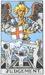This card represents the understanding of spiritual things, when we have achieved this, our conscious is ready to bond with the universal consciousness. We are one with the creator and understand the relationship between god and all of humanity. The coffins are dark and void of light and truth when they are closed. But here they are shown open and light of the angel above trumpeting the truth of the universal consciousness.