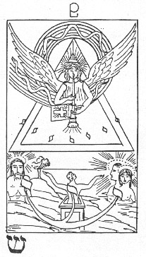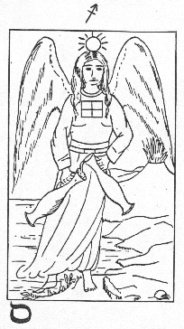The angel in the picture above is perfectly balancing and combining the two qualities of male and female, or positive and negative. The angel stands with one foot on the earth and one within the water at foot. This is also a perfect balance of the conscious and the subconscious mind. The red wings are symbolic of the fiery desires of the spirit to learn on a higher level of consciousness and the mountains in the background represent wisdom. The triangle is the higher knowledge that is acquired through introspection as the will to learn and understand can cause within us great doubt, but by following truth, we can select a path that leads us to the wisdom we so desire.