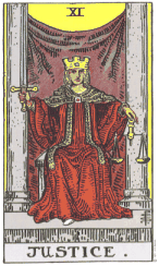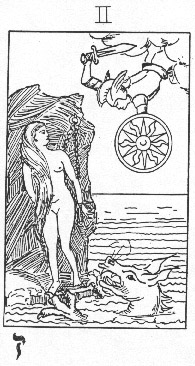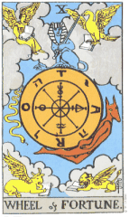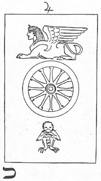 This card represents the grasp on the personna by understanding who you really are. When this happens you will never be without material possessions. The number 10 represents a new cycle meaning that the number 10=1 in numerology. The humanoid figure with the jackal head represents the evolution of man with its ears just over the center of the wheel. This represents that intuition and that inner voice allow man to rise to higher levels. The sphinx at the top of the wheel represents the ideal that we all try to strive for, the completed cycle balancing both male and female characteristics in perfect control. The figures in the corner represent the fixed signs of the zodiac.