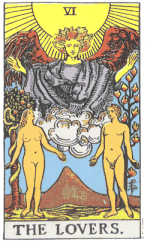 The Lovers card is symbolic of relationships and partners. This is the union of opposites but compatible things. The man and woman standing across from each other are naked, showing their differences. The man is standing looking to the woman, while she in turn is looking up at the angel above. The angel here is symbolic of the super-conscious. The man representing the conscious mind and the female representing the subconscious mind, and in this order... conscious, subconscious, superconscious..we must follow to reach the source of our power and draw on it to gain insight and inspiration. The tree behind the man represents the zodiac signs being twelve in number and the tree behind the woman represents the tree of wisdom, with the serpent representing the kundalini force risen to the highest point. It is only here that we can draw off the wisdom attainable to us, for if it remains coiled and low, our senses are bound to just the material. This card falls under the vibration of the number 6.