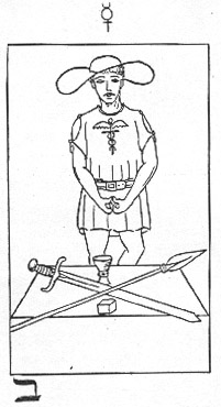 The magician represents the conscious mind. With focus on an idea or goal, the conscious mind sets into action these ideas and brings them forth to the material world. The magicians hands are stretched forth, one to the sky holding a wand, and the other pointing to the ground below. This is suggestive that as is "as above, so below". The table in front of him has all the tools to make this possible. The wand, cup, sword, and pentacle, which are representative of all the suits to the tarot cards. The mage has an undergarment of pure white, showing his pure wisdom and is held shut by the serpent around his waist. The outer garment is red, symbolic of desire and passion, which has no belt holding it shut so it can be removed if necessary. The flowers in the garden represent things as well. The red roses are symbolic of desires, and the white lilies represent pure thought, untainted by desire. This card is under the vibration of the number 1.