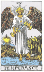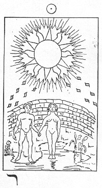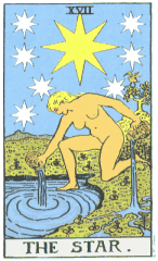 The woman in this card represents the subconscious mind gathering knowledge from the universal subconscious and pouring it over humanity. The right leg that supports her weight is bent in a 90degree angle suggesting that all will be learned if you search in the right places, with her foot resting in the pool of knowledge. The left hand pours the waters over the land and it disburses into 5 separate streams representing the 5 natural senses of man.