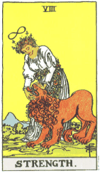 The Strength cards represents the control over material forces. The lion is a symbol of the fire within or the kundalini force that sits coiled within us at the base of the spine. The woman is symbolic of the subconscious, which controls vital functions without the need of conscious thought. She controls the lion with a gentle spiritual touch rather than from brute force. This card falls under the vibration of the number 8.
