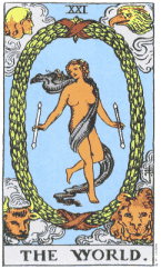 This card represents the continuance and never-ending cycle of life. The four figures in the corners of the card represent the 4 fixed zodiac signs that represent that the laws of the universe remain unchanged and orderly. The wreath surrounding the woman is symbolic of a zero which is the symbol of god and from which all things emerge.