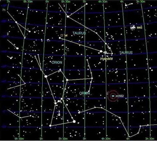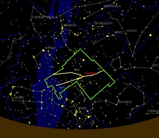 Taurus is a large and prominent constellation in the northern hemisphere's winter sky, between Aries to the west and Gemini to the east; to the north lie Perseus and Auriga, to the southeast Orion, to the south Eridanus, and to the southwest Cetus. In September and October, Taurus is visible in the evening along the eastern horizon. The most favorable time to observe Taurus in the night sky is during the months of December and January. By March and April, the constellation will appear to the west during the evening twilight.