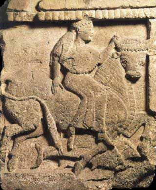 In early Mesopotamian art, the Bull of Heaven was closely associated with Inanna, the Sumerian goddess of sexual love, fertility, and warfare. One of the oldest depictions shows the bull standing before the goddess' standard; since it has 3 stars depicted on its back (the cuneiform sign for "star-constellation"), there is good reason to regard this as the constellation later known as Taurus.