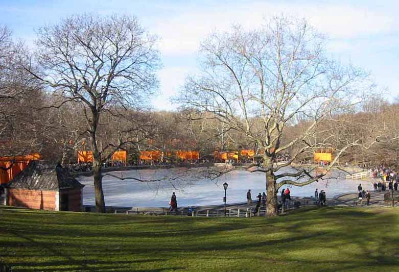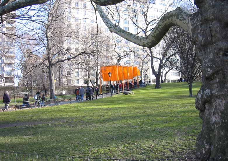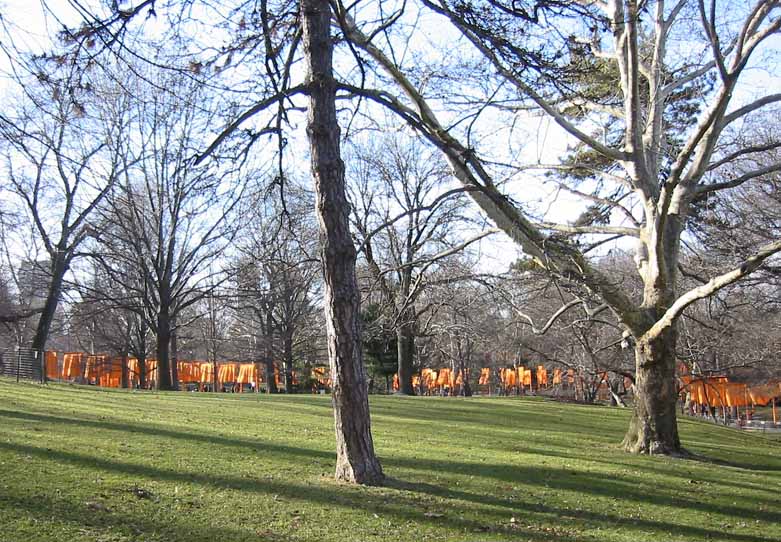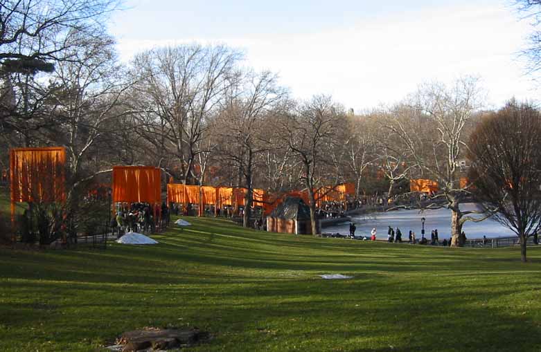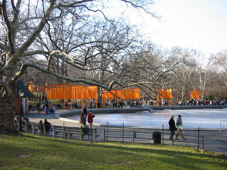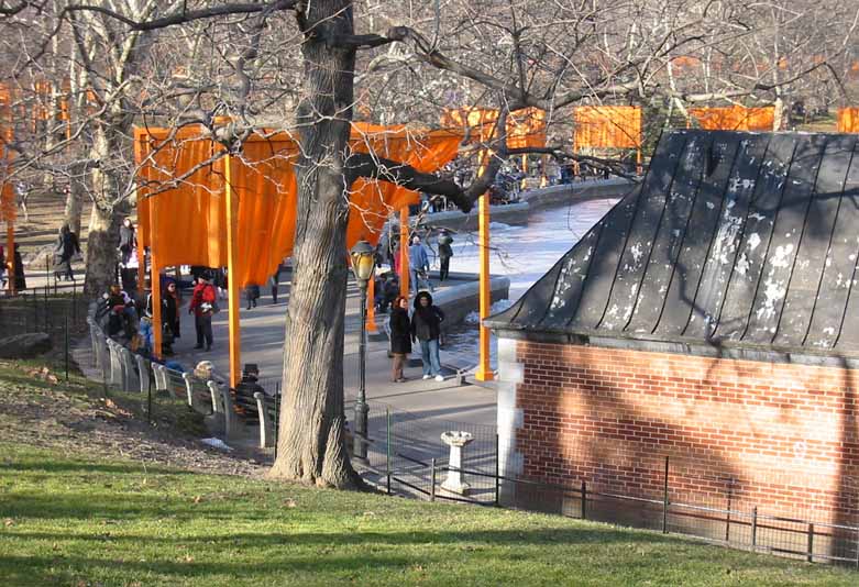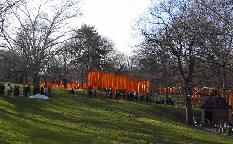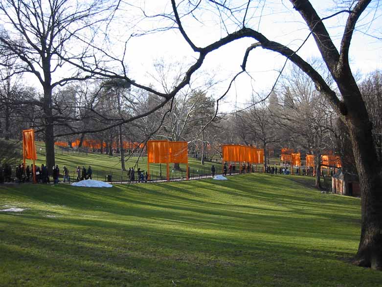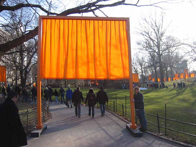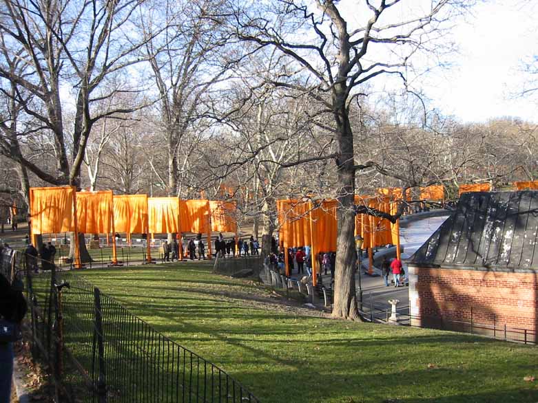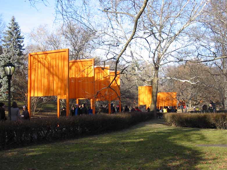 The Gates were a group of gates comprising a site-specific work of art by Bulgarian artist Christo Yavacheff and French artist Jeanne-Claude, known jointly as Christo and Jeanne-Claude. The artists installed 7,503 vinyl "gates" along 23 miles (37 km) of pathways in Central Park in New York City. From each gate hung a panel of deep saffron-colored nylon fabric. The exhibit ran from February 12, 2005 through February 27, 2005. According to Christo's web site, all told, 7,503 individual gates were installed.