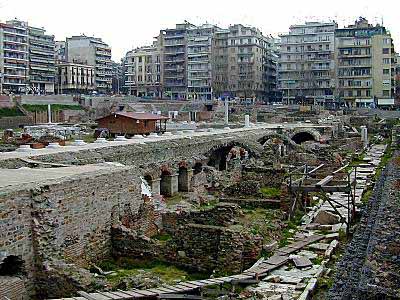Very little has been uncovered at ancient Thessalonica because Thessaloniki sits atop the remains. The area pictured above and at right was formerly a bus station; when it was moved in 1962, this 1st or 2nd century A.D. forum was revealed. Excavators found a bathhouse and mint dating to the 1st century A.D. below pavement surrounding an odeum. An inscription (30 B.C. to 143 A.D.) from the Vardar gate bears the word politarches, the word Luke used in reference to the officials of the city before whom Jason was brought by the mob (Acts 17:6). The word does not appear in any other Greek literature but does match the archaeology of the site.