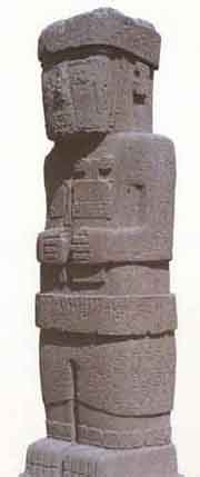 This is one of two large anthropomorphic figures standings in the southwest corner of the Kalasasaya Temple. This one faces the entrance and is placed on the central axis. With the exception of the Sun Gate, it is the most picturesque of the sculptures at Tiahuanacu, since its 7-foot height is almost covered with hieroglyphic-like carvings. No one knows if these carvings represent a form of writing or are merely decorative. The figures resemble those on Easter Island.
