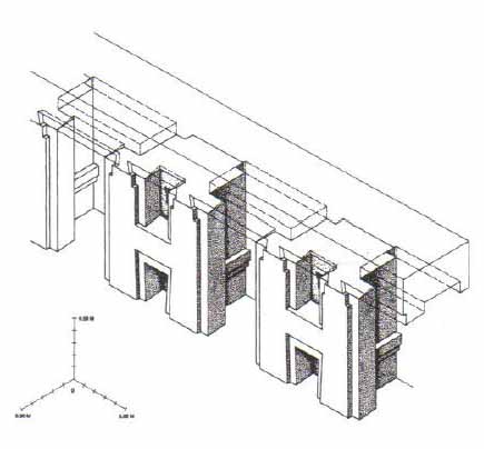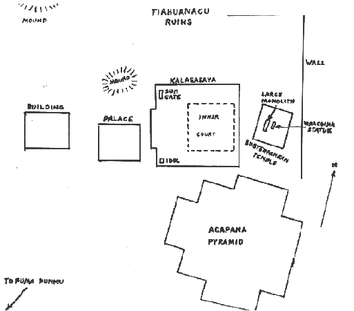 The most important edifice for dating purposes is the Kalasasaya ("Place of the Vertical Stones"). It is built like a stockade with 12 foot high columns jutting upward at intervals, each of these being carved into human figures.