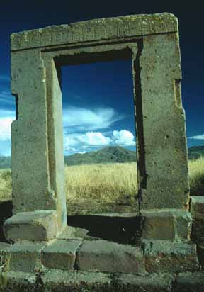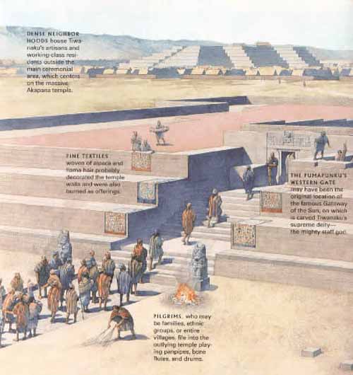 Within many of the sites structures are impressive gateways; the ones of monumental scale being placed on artificial mounds, platforms, or sunken courts. Many gateways show iconography of "Staffed Gods" that also spreads to some oversized vessels, indicating an importance to the culture. This iconography is most present on the The Gateway of the Sun.