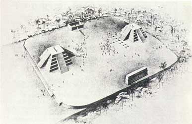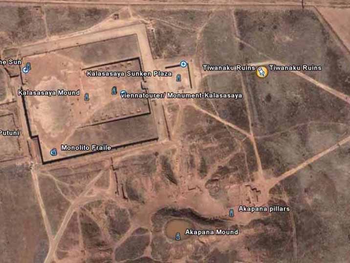 The largest terraced step pyramid of the city, the Akapana, was once believed to be a modified hill, and has proven to be a massive human construction with a base 656 feet square and a height of 55.8 feet. It is aligned perfectly with the cardinal directions. Its base is formed of beautifully cut and joined facing stone blocks. Within the cut- stone retaining walls are six T- shaped terraces with vertical stone pillars, an architectural technique that is also used in most of the other Tiwanaku monuments. It originally had a covering of smooth Andesite stone, but 90% of that has disappeared due to weathering. The ruinous state of the pyramid is due to its being used as a stone quarry for later buildings at La Paz. Its interior is honeycombed with shafts in a complicated grid pattern, which incorporates a system of weirs used to direct water from a tank on top, going through a series of levels,and finally ending up in a stone canal surrounding the pyramid. On the summit of the Akapana there was a sunken court with an area 164 feet square serviced by a subterranean drainage system that remains unexplained.
