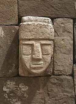 In 1934 the Peruvianist Wendell C. Bennett carried out several excavations at Tiwanaku. Excavating in the Subterranean Temple he found two large stone images. One was a bearded statue. Depicted are large round eyes, a straight narrow nose and oval mouth. Rays of lightning are carved on the forehead. Strange animals are carved up around the head. It stands over 7 feet tall with arms crossed over an ankle- length tunic, which is decorated with pumas around the hem. Serpents ascend the figure on each side, reminding one of the Feathered Serpent culture-hero known as Quetzalcoatl in Central America.