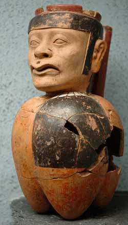 Tiwanaku sculpture is comprised typically of blocky column-like figures with huge, flat square eyes, and detailed with shallow relief carving. They are often holding ritual objects like the Ponce Stela or the Bennett Monolith. Some have been found holding severed heads such as the figure on the Akapana, possibly a puma-shaman. These images suggest ritual human beheading, which correlate with the discovery of headless skeletons found under the Akapana.