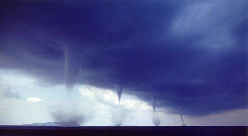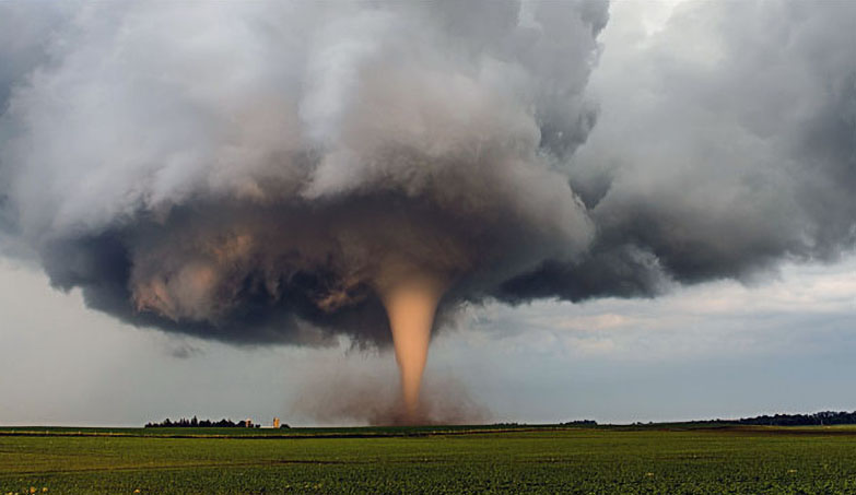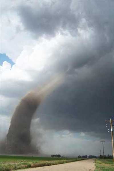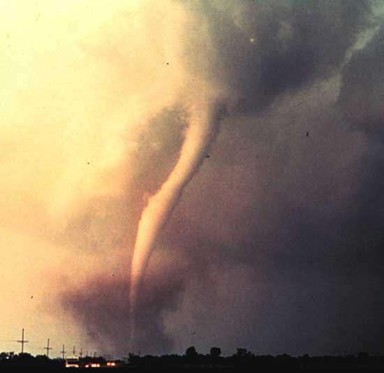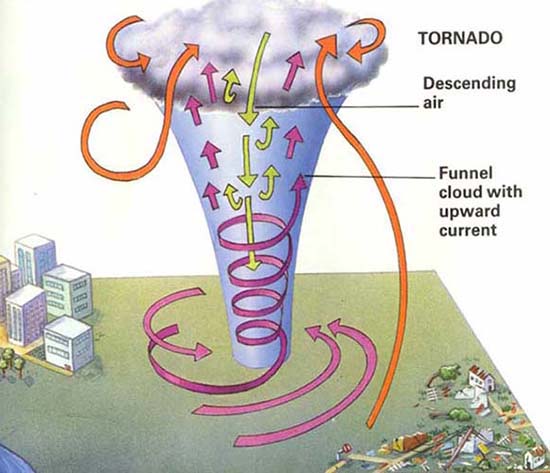 A tornado is a violent, rotating column of air which is in contact with both the surface of the earth and a cumulonimbus cloud or, in rare cases, the base of a cumulus cloud. The most intense of all atmospheric phenomena, tornadoes come in many shapes and sizes but are typically in the form of a visible condensation funnel, whose narrow end touches the earth and is often encircled by a cloud of debris and dust.