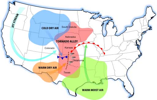 Although the official boundaries of Tornado Alley are not clearly defined, the main alley extends from northern Texas, through Oklahoma, Kansas, Nebraska, Iowa, South Dakota, Minnesota, Wisconsin, Illinois, Indiana, Missouri, Arkansas, North Dakota, Montana, and Ohio. Research suggests that the main alley may be shifting eastward away from the Great Plains, and that tornadoes are also becoming more frequent in the northern parts of Tornado Alley where it reaches the Canadian prairies. Read more ...