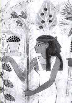In tomb depictions, the deceased, frequently accompanied by his wife, was shown sitting under or near the branches of a tree, with Hathor sprouting from the trunk, enjoying the fruit and drink offered by this goddess. An excellent example of such a representation is in the Theban tomb of Sennedjem.
