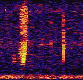 What created this strange sound in Earth's Pacific Ocean? Pictured above is a visual representation of a loud and unusual sound, dubbed a Bloop, captured by deep sea microphones in 1997. In the above graph, time is shown on the horizontal axis, deep pitch is shown on the vertical axis, and brightness designates loudness. Although Bloops are some of the loudest sounds of any type ever recorded in Earth's oceans, their origin remains unknown.