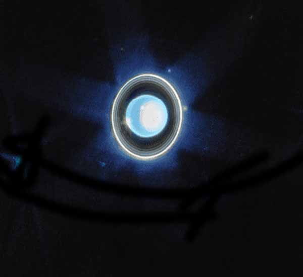 The Very Large Telescope (VLT) has caught a remarkable image of the planet Uranus circled by some of its moons. The rings of the planet - which is 3,000 million kilometres away from Earth - are clearly displayed in the image. The rings are almost undetectable from Earth in visible light. The VLT is located at the European Southern Observatory's Paranal Observatory in Chile. The image was obtained in the near-infrared, and includes seven of the planet's moons.