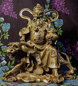 In China, the tiger is considered the king of all beasts and represents powerful energy. Further, the tiger is associated with Tsai Shen Yeh, the Chinese God of Wealth usually seen sitting on a tiger in Asian art. Asian lore considers the tiger the protector of the dead, and will often be seen in graves as a mark of protection, assuring peace for those who have passed. Tigers are considered a yang energy, and are also a solar animal which associates them with symbolisms of the sun, summer and fire. In ancient Chinese myth there are five tigers that hold the balance of cosmic forces in place and prevent chaos from collapsing into the universe.