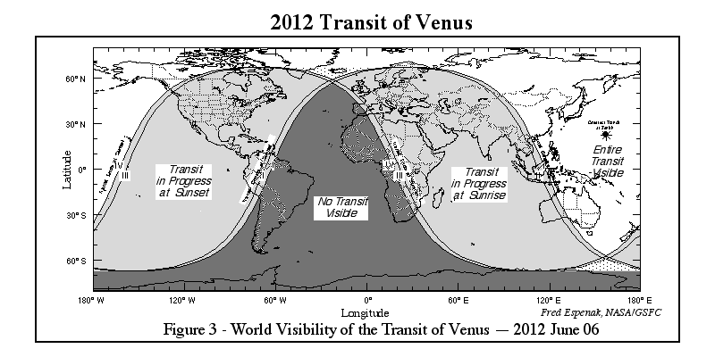 On June 5th, 2012, Venus will pass across the face of the sun, producing a silhouette that no one alive today will likely see again. Transits of Venus are very rare, coming in pairs separated by more than a hundred years. This June's transit, the bookend of a 2004-2012 pair, won't be repeated until the year 2117. Fortunately, the event is widely visible. Observers on seven continents, even a sliver of Antarctica, will be in position to see it. The nearly 7-hour transit begins at 3:09 pm Pacific Daylight Time (22:09 UT) on June 5th. The timing favors observers in the mid-Pacific where the sun is high overhead during the crossing. In the USA, the transit will at its best around sunset. That's good, too. Creative photographers will have a field day imaging the swollen red sun "punctured" by the circular disk of Venus.