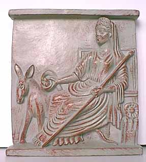 The ass is Vesta's sacred animal, whose braying supposedly kept the lascivious Priapus away. Vesta is portrayed as a stern woman, wearing a long dress and with her head covered. Her right hand rests against her side and in her left hand she holds a scepter.